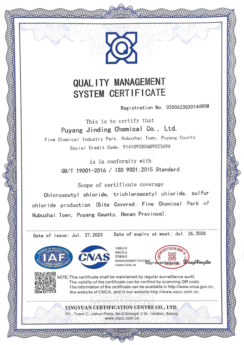 濮陽市金鼎化工有限公司所屬其他基礎化學原料制造,公司主要產品規模為:10000噸/年氯乙酰氯、10000噸/年氯乙酸、5000噸/年氯化硫、6000噸/年氯甲醚、5000噸/年三氯乙酰氯、7000噸/年氯乙酸甲酯、3000噸/年二氯乙酸甲酯,副產鹽酸13000噸/年。產品廣泛應用于醫藥、農藥、染料、膠劑等行業。